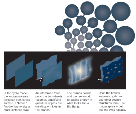 String theory itself — which calls for a space with many rolled-up dimensions — may suggest a different type of pre–Big Bang picture. In a model developed by Steinhardt, now at Princeton University, and Turok, now director of the Perimeter Institute in Waterloo, Canada, the Big Bang is replaced with an endless cycle of contractions and bounces; 13.7 billion years is merely the time since the last “Big Bounce.”