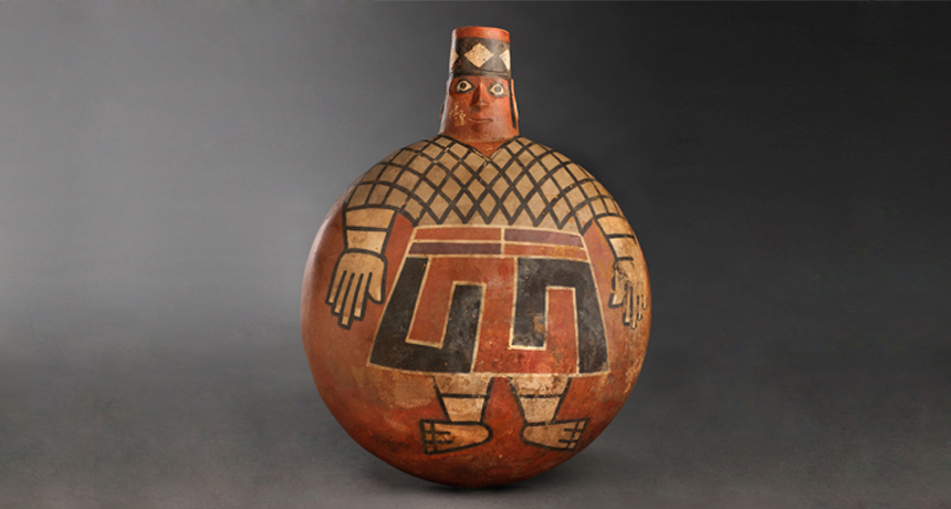 PRE-INCAN GAZE A painting of a Wari lord decorates this 1,200-year-old ceramic flask, which archaeologists found with the body of a queen in a tomb in Peru.