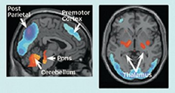 In 1994, Eidelberg visualized cellular metabolism by measuring fluoro-deoxy-glucose (FDG), which cells take up when they’re active. Parkinson’s patients showed an overactive pattern of metabolism in several brain regions related to motor function. The elevated activity occurred not just in the subcortical brain, which includes the substantia nigra, but also in the motor cortex, which issues neural commands to the body’s muscles, and the cerebellum, which regulates posture and balance.