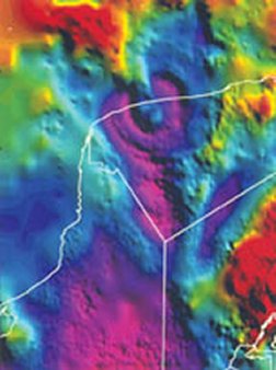 Extraterrestrial impacts leave distinct calling cards. For instance, when a rock’s temperature rises above its so-called blocking temperature, any magnetic fields in the minerals are disrupted and then realign to match the strength and direction of the magnetic fields in the rock’s environment. This phenomenon takes place in molten rocks spewing from volcanoes and undersea ridges, but it also takes place in the wake of meteor strikes. If the magnetic field at the location of an extraterrestrial impact is significantly different from the one in place when those rocks last cooled, then the cosmic bruise will produce magnetic anomalies.