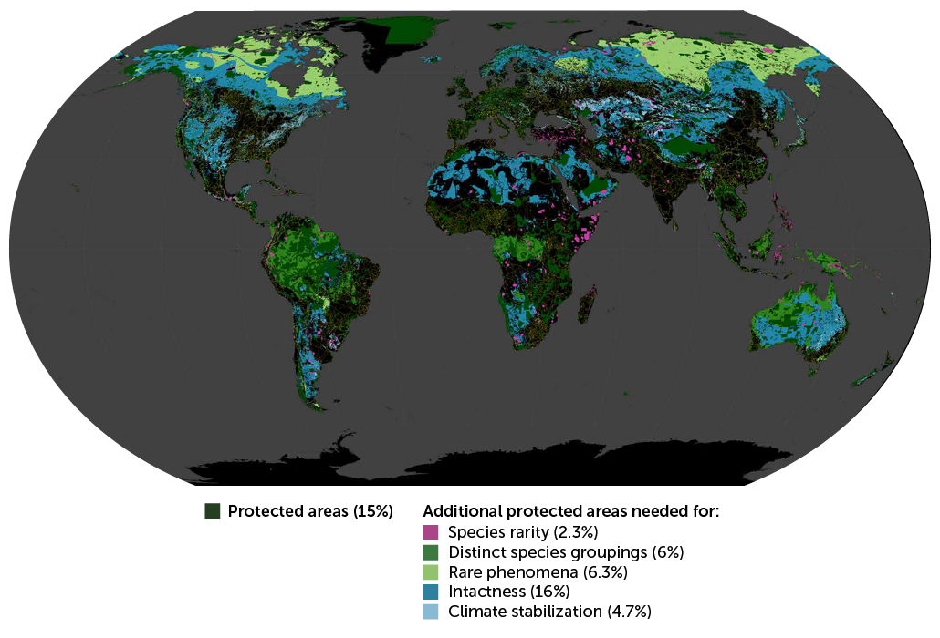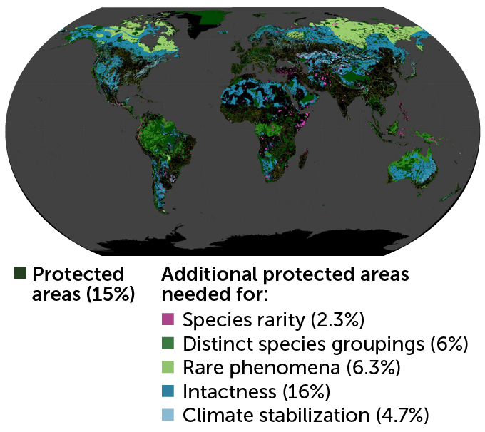 Eric Dinerstein, a conservation biologist at RESOLVE, a nonprofit based in Washington, D.C., and colleagues began by mapping out existing protected areas, which cover about 15 percent of land. The team then sequentially added slices of land needed to meet different conservation goals, using existing biodiversity databases.