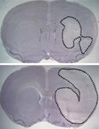 BRAIN SHIELD. A rat with extra neuroglobin in its brain (top) suffers less tissue damage (outlined areas) after a stroke than a typical rat (bottom) does. Y. Sun et al./PNAS