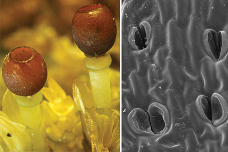 Sphagnum bears its spores in a perky, almost spherical, lidded capsule that sits atop a little stalk and may be reddish, brown or black. The capsule’s outer cells have tiny pores previously thought to be stomata that aid in gas exchange in plants. For generations, scientists also thought these pores contributed to the large buildup of pressure that, when released, supposedly blew off the capsule lid and flung the spores. Other plants such as brown algae and some fungi explosively release their spores, perhaps through hydrostatic pressure. But experiments with intact and pricked capsules suggest the pores are poseurs, actually pseudostomata that dry out and crumple but have nothing to do with gas exchange. As the cells dry, the capsule shrinks, ejecting its lid and flinging spores.
