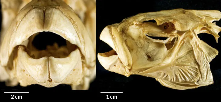 It was those strange beaks, more parrot than shark, that first nibbled Fraser’s scientific curiosity. The first teeth in baby puffers seem unremarkably vertebrate. But as the young fish grow up, the rows of pointy bits gives way to two nubs that stretch sideways along the jaw, eventually creating a pair of long, sharp-edged blades. With one set of blades along the upper jaw and another on the lower, adult puffers “can chop a fish in half and then feast on it,” he says. Aquarists need to feed their pufferfishes plenty of hard-shelled mollusks to wear down the blades or trim them back with a fish version of a nail clipper. If the beaks overgrow, the fish can’t eat.