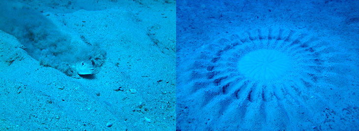 Sand underwater holds allure as well. Males of a species not recognized until 2014 turned out to be the architects of mysterious underwater versions of crop circles. These white-spotted pufferfish (Torquigener albomaculosus) spend days plowing and fin flapping sand into great symmetrical rosettes as welcome mats for female visitors.