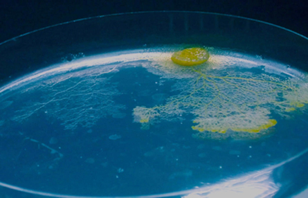 “A slime mold is just a little bag of goo,” Reid says, though with evident affection. The big crawling cells form when two spores of compatible types burst to life, meet and fuse. “It’s like a sperm cell meeting an egg,” Reid says. The resulting entity, called a plasmodium, engulfs debris and grows, with its nuclei dividing but no split in the cell. The little bits of living tissue making up this big cell pulse independently, speeding up or slowing down depending on what they nudge in their immediate environment. Like birds in a flock or fish in a school, pulsing bits can influence the motion of their immediate neighbors, a way of passing information through the organism. Although technically one cell, a slime mold plasmodium acts like a collective. “It’s alien stuff,” as Reid puts it.