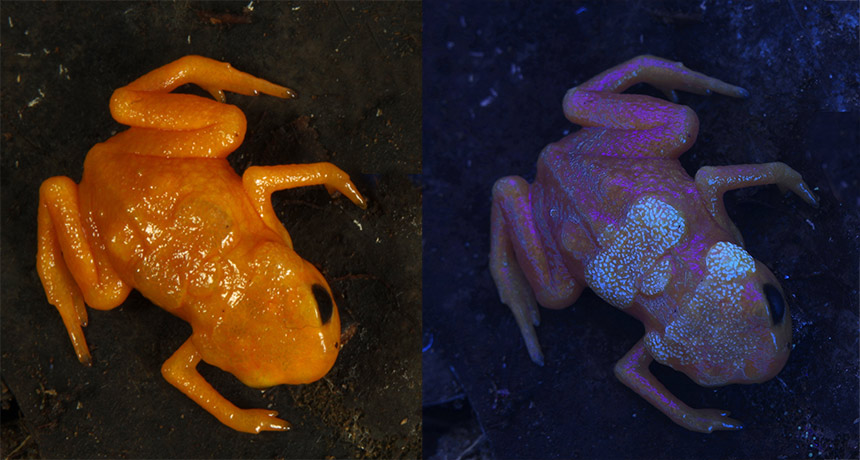 FUNKY FROGS Pumpkin toadlets, native to southeastern Brazil, are the first known frogs to have bony plates that glow through their skin when illuminated with ultraviolet light.