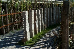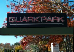 A neon sign marks the entrance to Quark Park in Princeton, N.J. Marc Pelletier’s 120-cell sculpture is visible below the sign. I. PetersonWhen struck by a metal rod, each of these granite pillars emits a tone.