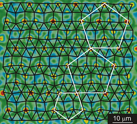 Then the team switched on five lasers, arranged so that the light beams would interfere with one another and create a complex pattern with lots of five-fold symmetry. The plastic beads were attracted to the spots where the laser was most intense, creating the quasicrystal the team had been hoping for.