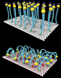 Making the surface took some computation and a neat chemical trick. When the bristle molecules assemble themselves onto a gold surface, they usually pack together so tightly that they can’t bend over. To overcome this problem, Lahann and his coworkers ran simulations that showed that each molecular bristle needs at least 0.65 square nanometer to bow. So, the team found a chemical group that takes up about