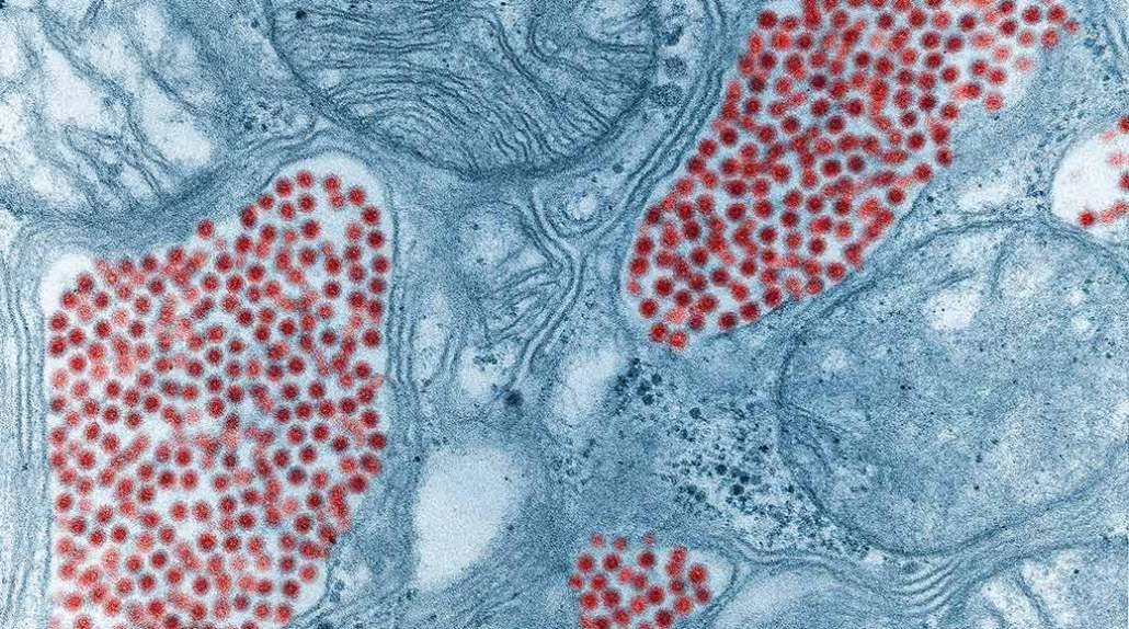 Mosquitoes can spread the virus that causes eastern equine encephalitis. This microscope image shows a mosquito’s salivary glands infected with the EEE virus (red).