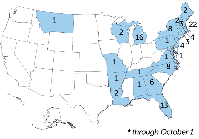 U.S. states with confirmed eastern equine encephalitis cases, 2009–2019*