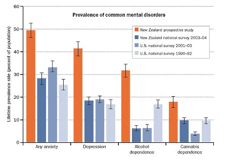 Among 32-year-old New Zealanders, Moffitt and her colleagues find lifetime prevalence rates of 50 percent for anxiety disorders, 41 percent for depression, 32 percent for alcohol dependence and 18 percent for marijuana dependence. Participants who developed one of these disorders tended to experience others as well, including less-common ones such as eating disorders.