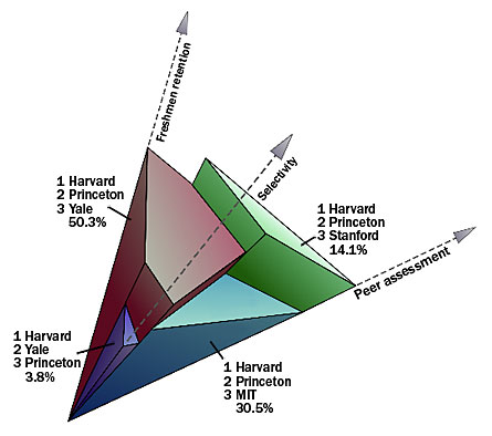 Finding the second or third best school, according to a particular set of priorities, required a bit more mathematical maneuvering but the same basic technique applied. The researchers then calculated the range of rankings a particular school could have according to all possible sets of priorities, excluding fluke rankings a school achieved only rarely.