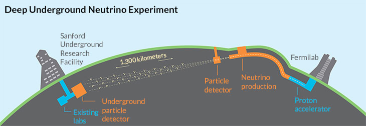 In the Deep Underground Neutrino experiment, slated to begin in the next decade, neutrinos (ν) produced at Fermilab in Batavia, Ill., will journey 1,300 kilometers to the Sanford Underground Research Facility near Lead, S.D. There, underground detectors will record how these ghostly particles have morphed from one type to another.