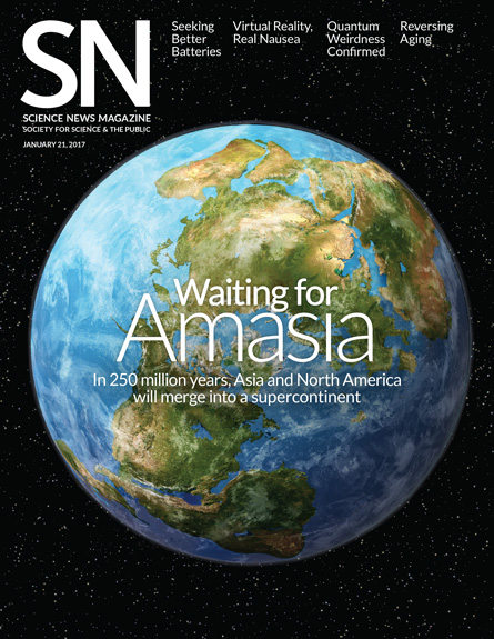 From Nuna to Pangaea, shifting landmasses have repeatedly reshaped Earth’s surface. Researchers are now picturing a future supercontinent dubbed Amasia, due in 250 million years, Alexandra Witze reported in “Supercontinent superpuzzle” (SN: 1/21/17, p. 18).