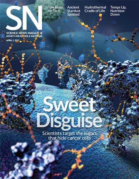 A new wave of potential immune therapies aims to target the network of complex sugars that coat cancer cells, Esther Landhuis reported in “Cancer’s sweet cloak” (SN: 4/1/17, p. 24). Some of these sugars, called sialic acids, help tumors hide from the immune system.