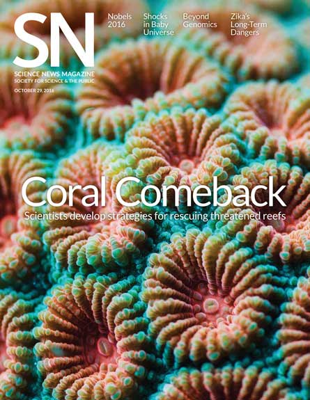 Algae that provide nutrients to corals turn toxic and lead the corals to “bleach” and sometimes die when ocean temperatures spike. Researchers are seeding damaged reefs with baby corals and breeding heat-tolerant corals to help these imperiled marine animals, Amy McDermott reported in “Rebuilding reefs” (SN: 10/29/16, p. 18).