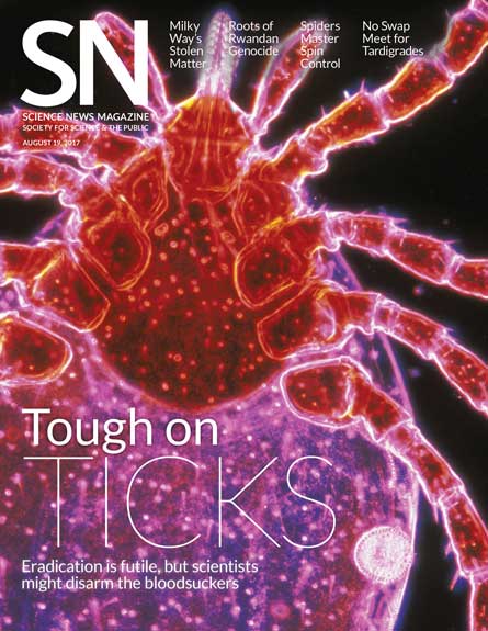 In the fascinating facts about tick biology presented in the Editor’s Note in the August 19 issue (SN: 8/19/17, p. 2), the amount of weight a tick can gain from a single blood meal was incorrect. Though ticks can consume more than 200 times their weight in blood, they salivate much of the water in the blood back into the host. Total weight gain is thus closer to 100 times the unfed weight. This is equivalent to an average U.S. man gaining nearly 20,000 pounds in a single meal.