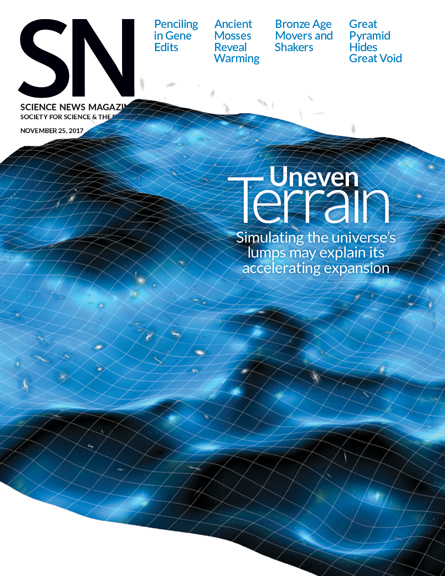 Some cosmologists hope to explain the universe’s accelerating expansion by fully accounting for the universe’s lumpiness, Emily Conover reported in “Simulating the universe using Einstein’s theory of gravity may solve cosmic puzzles” (SN: 11/25/17, p. 22).