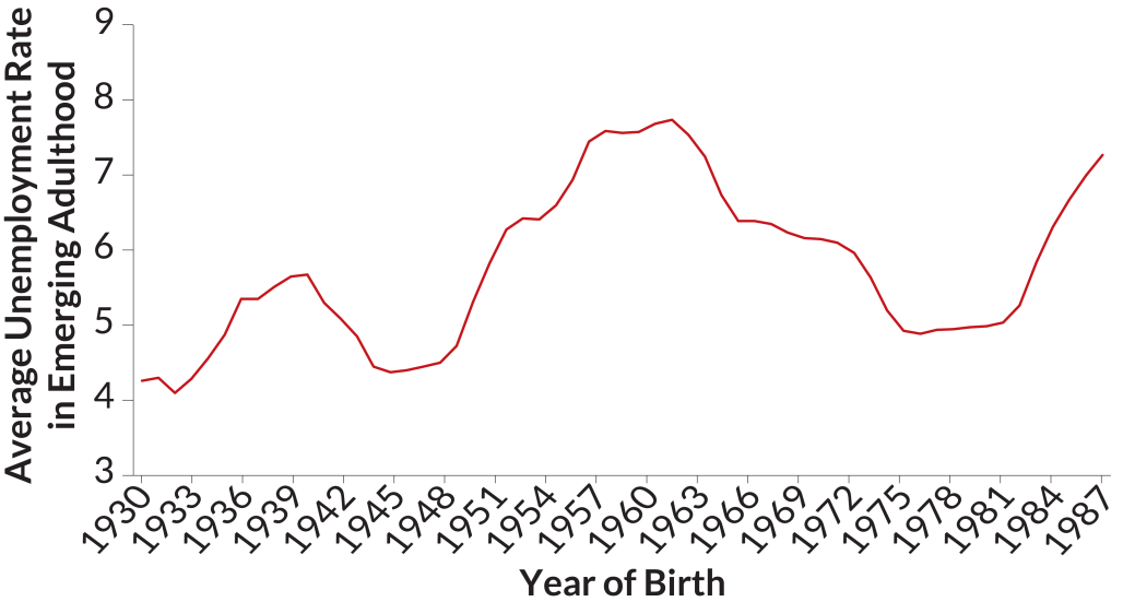 SELF ADJUSTMENTS This graph shows changes in average national unemployment rates (from a low of 4.28 percent to a high of 7.73 percent) during young adulthood for volunteers in a new study, by year of birth. Those who faced peaks of unemployment were less narcissistic later in life than those who encountered the best employment prospects.