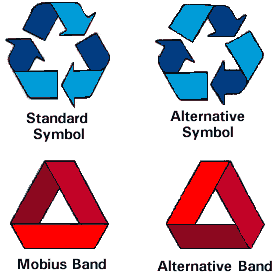 The standard recycling symbol (top left) and an alternative version (top right) can be represented by continuous folded ribbons, showing that the standard form is a Möbius band made with one half-twist (bottom left) and the alternative is a one-sided band with three half-twists (bottom right). |