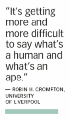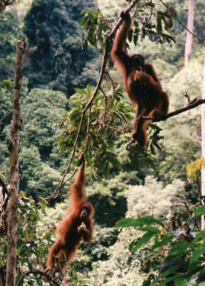 Look, up in the trees. A barrel-chested, long-limbed creature covered with wispy, reddish hair sits on a branch far above the ground. The animal rises to a fully erect posture, reaches up to grab an overhead branch for balance, and promenades across the precarious platform.