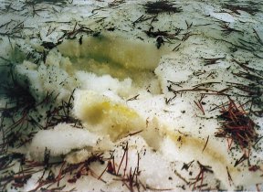 These species never develop the extensive red pigments that protect watermelon snow algae from brilliant sunlight. The green snow algae, mostly in the genus Chloromonas, typically stick to high-elevation, shady forests of fir and spruce. These algae generally bloom several inches below the snow surface. Orange species tolerate a bit more light, and Duval and Hoham spotted their salmon-colored alga in the open snow of several New England ski resorts. They haven’t found the species in wilderness areas yet, and they speculate that it spreads in part by hitchhiking on skis.