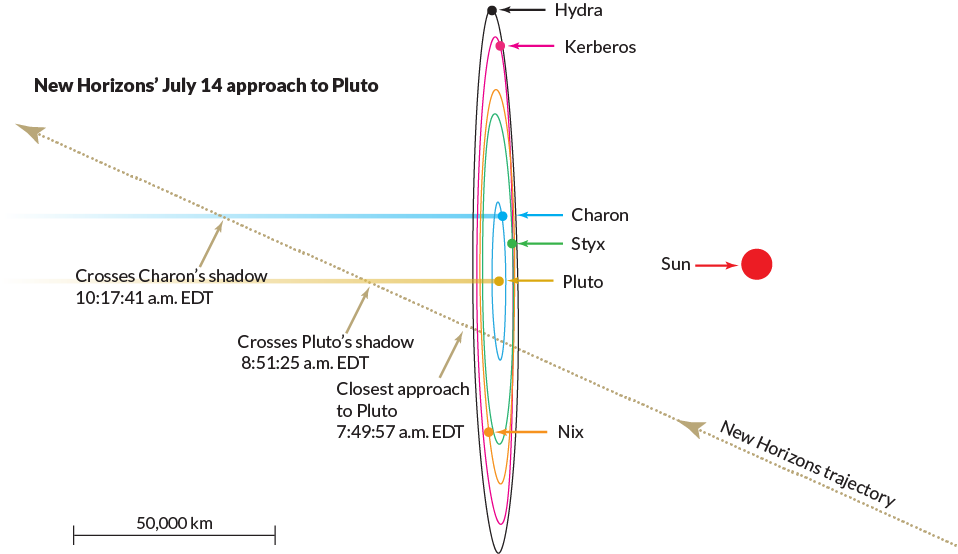 PLUTO IN SIGHT The New Horizons spacecraft launched in 2006 on a 9.5-year, 5-billion-kilometer trek across the solar system to spend a few hours with Pluto and its five known moons. The probe will tear past the dwarf planet on July 14 and provide humankind with its first intimate look at the remote world in orbit around the sun.