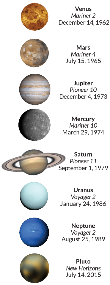 Adapted from NASA, JHUAPL, SWRI; photo illustration by M. Telfer; background image: NASA; Earth: NASA; other planets: see below