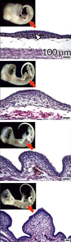 IMPORTANT SPOTS Tiny bumps (blue dots) on the skin of mammals, birds and reptiles point to shared ancestral structure of hair, feathers and scales. Mouse (far left), snake, chicken and Nile crocodile embryos shown.
