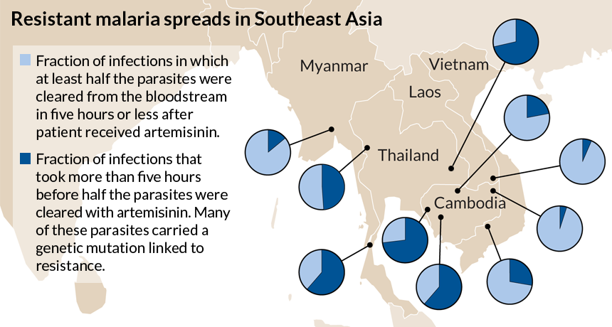 The study also solidifies a link, found in earlier research, between delayed parasite clearance and mutations in a P. falciparum gene called kelch13. The presence of these mutations might aid in tracking drug resistance, says study coauthor Nicholas White, a tropical medicine physician at Mahidol University in Bangkok. How the mutation helps the parasite remains unknown, he says.