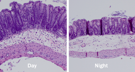 In mice infected with Salmonella during the day, the lining of the large intestine (stained dark purple) became thicker and more inflamed than in mice infected during the night.