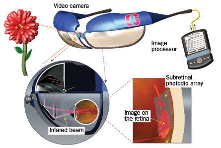 For starters, there are the goggles. A miniature video camera sits on the nosepiece, watching the world. Information from the camera streams to a portable computer about the size of a smartphone. This computer processes the video images, which are projected into the eyes by near-infrared lasers on the insides of the goggle lenses. The laser hits slender photovoltaic chips implanted beneath the retinas, which convert the light into electrical current, stimulating nerve cells that send information to the brain.