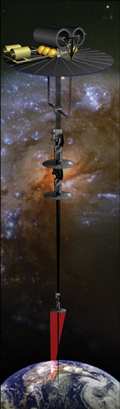 Although the article mentions that “debris” would be a hazard to the cable, it neglects to note that the cable would be a major hazard to satellites. Almost any non-geosynchronous satellite would hit it eventually. For a different scheme using nanoengineered materials, have a look at http://discuss.foresight.org/~josh/tower/tower.html .