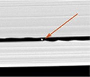 The other ring-bound Saturnian moon, 16-km-wide Pan, orbits along a closer-in clearing called the Encke gap and creates similar wavelike features. The moons Prometheus and Pandora, which lie on either side of Saturn’s narrow F ring, also produce the scalloping effect.