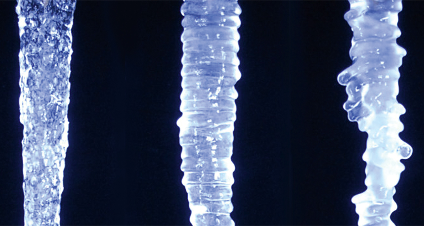 SALTY SHAPES Frozen alone, distilled water produced an unrippled, carrot-shaped icicle (left). When scientists added a pinch of sodium chloride, or table salt, to the freezing water, regularly spaced ripples formed (center). Adding more salt made the ripples become wildly irregular (right).