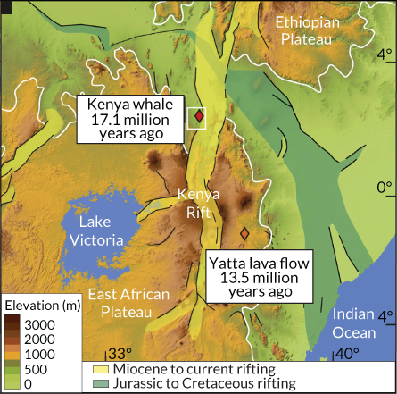 STUCK UP A beaked whale that got stuck in a river 17 million years ago is helping to pinpoint when the East African Plateau began to rise.