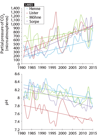 Detailed observations of lake chemistry over long periods of time are rare. But researchers found data from 1981 to 2015 on four reservoirs in Germany, allowing the scientists to calculate how much CO2 levels had risen and how much pH levels, measuring acidity in the water, had dropped, the scientists report online January 11 in Current Biology.
