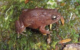 HIGH RISKS. A tangerine nursery frog, which lives only in the mountainous rain forests of Queensland, Australia, faces grave perils from climate change. Williams
