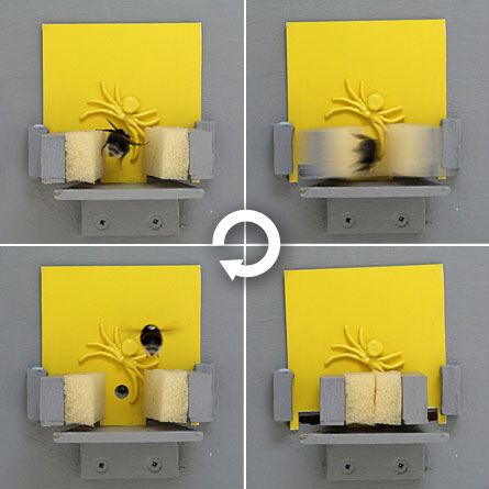 For the learning tests, the researchers positioned spider models, either a high-contrast white or camouflaged yellow, on four randomly selected yellow rectangles. Each bee saw only one kind of spider. Ings immobilized any bee that landed between the sponge jaws of these infested rectangles.