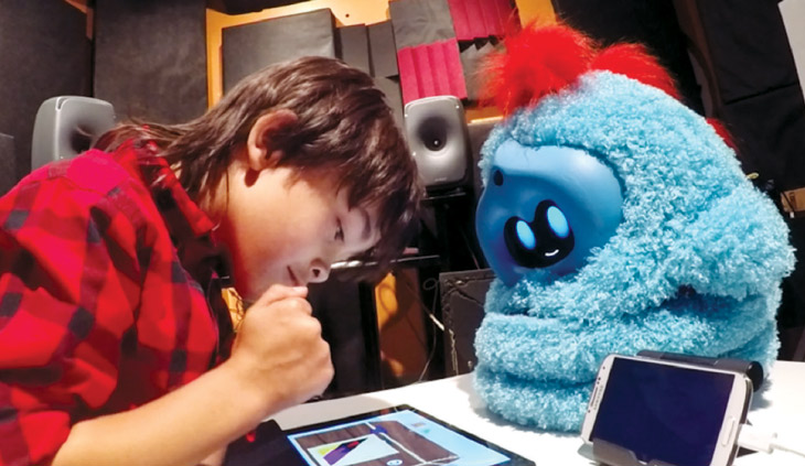 “What are we trying to find?” asks the plush, red and blue robot called Tega that’s perched on the desk beside the girl. The bot resembles a teddy bear–sized Furby.