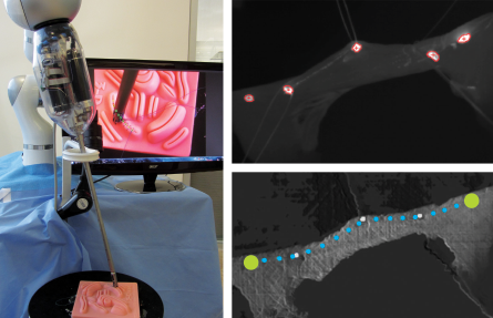 To keep track of its position on tissue, STAR uses near-infrared fluorescent imaging (like night vision goggles) to follow glowing dots marked by a person. To orient itself in space, STAR uses a 3-D camera with multiple lenses.