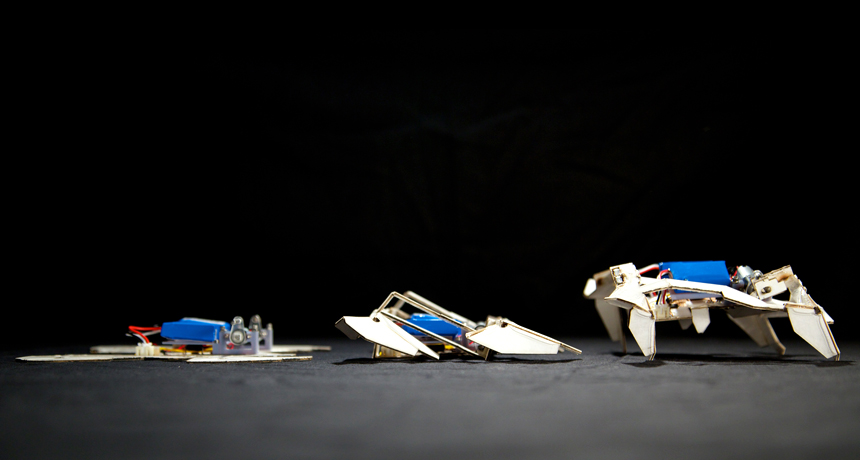 TRANSFORMER A flat robot about the size of an iPad mini and made mostly of paper and plastic can fold itself into a crawling machine.