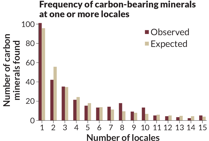The number of minerals found at only one locale is expected to decrease as more minerals are found. But of all known carbon-bearing minerals (maroon bars), most have been found in only a handful of places. Anticipated finds (tan bars) based on statistical analyses, offer hope of yet-to-be-found minerals.