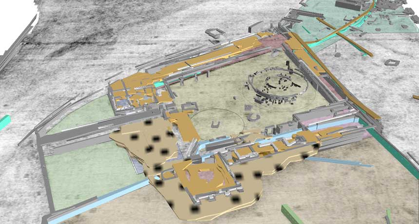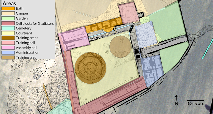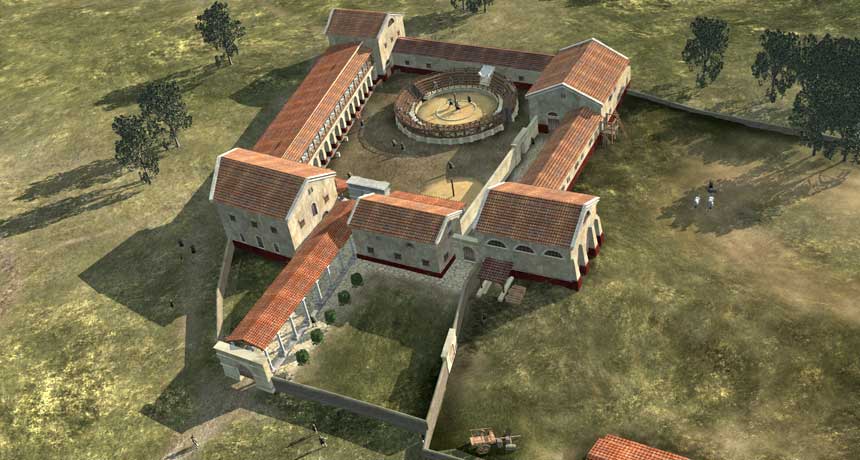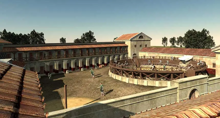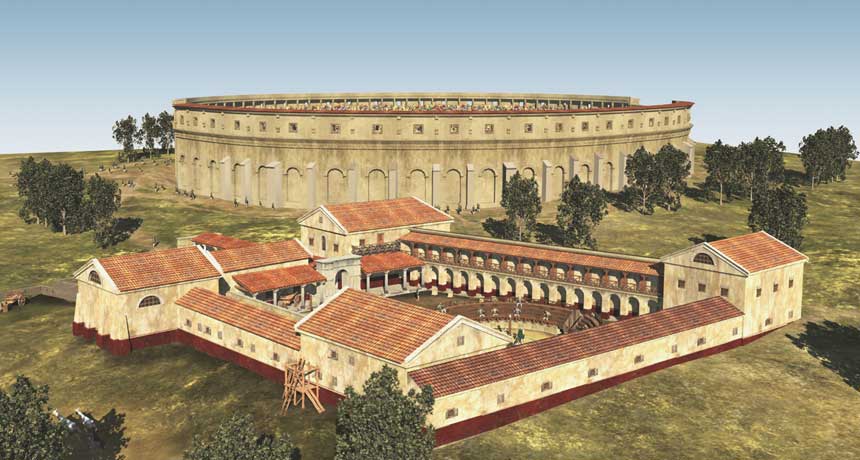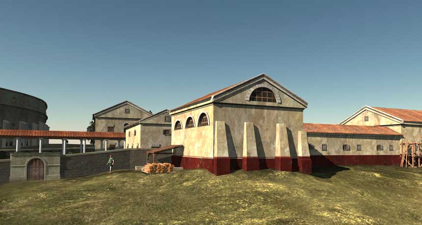 This virtual reconstruction of the gladiators’ school shows its courtyard and training arena.