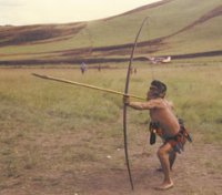 A Yanomami man demonstrates how to use his super-sized bow and arrow.