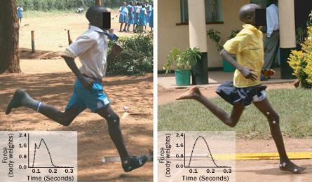 Lieberman and colleagues traveled to the Rift Valley Province in Kenya and videotaped the movement styles of some famed endurance runners who grew up not wearing shoes. The researchers found that, as expected, these runners typically strike the ground with either the forefoot or the midfoot before lowering their heel. In contrast, shod runners in the United States typically landed on the heel first.