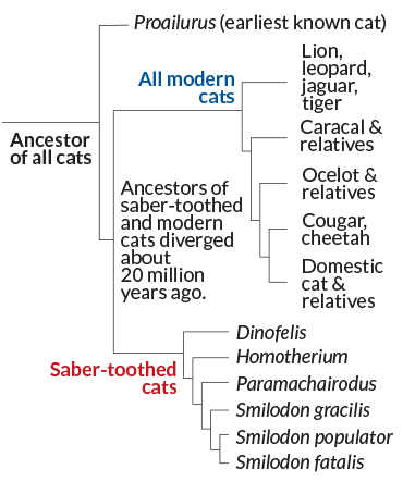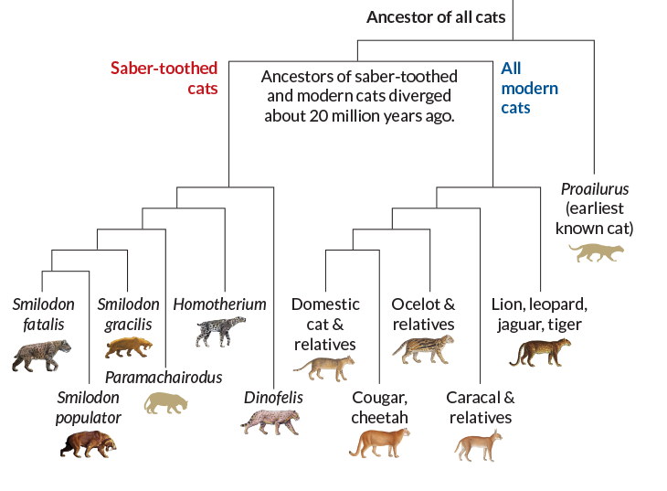 Smilodon and its extinct saber-toothed relatives are on a branch of the cat family tree that is far from today’s cats. Scientists think Smilodon’s branch diverged from the ancestors of all living cats about 20 million years ago. Given the evolutionary distance, researchers are still trying to determine how similar — or different — Smilodon was from its living feline cousins. A recent focus has been the cat’s sounds and senses.
