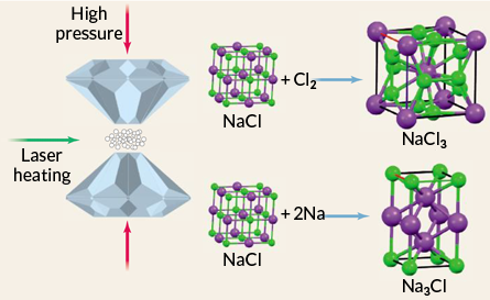 By using X-ray diffraction measurements, the researchers discovered that the extreme conditions altered how the atoms bonded by allowing them to get closer to one another. In doing so, the compounds break the so-called octet rule, which states that atoms in the first rows of the periodic table tend to form bonds that complete a set of eight electrons in the outskirts of their electron cloud. In the new compounds, the sodium and chlorine atoms did not always have eight electrons spinning in their outer orbits.